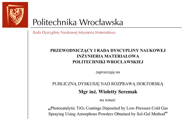 Tytuł pracy: Photocatalytic TiO2 Coatings Deposited by Low-Pressure Cold Gas Spraying Using Amorphous Powders Obtained by Sol-Gel Method
